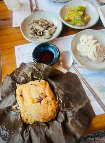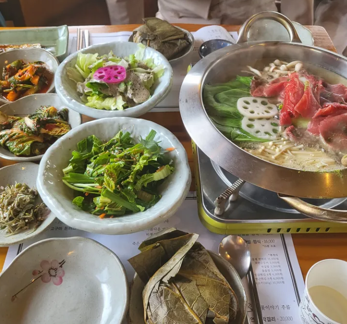 이 정식은 신선한 재료로 만들어진 다양한 반찬과 함께 제공되며, 특히 연잎에 싸여 있는 밥은 향이 깊고 맛이 일품입니다.