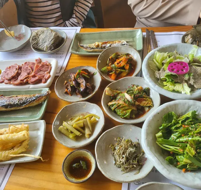 전통 한식이 제공되며, 다양한 반찬들이 함께 나옵니다.