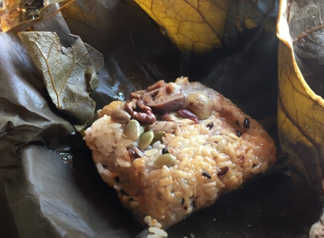 연잎밥에는 기장,수수,녹두,팥, 통녹두,은행, 울타리콩,검정쌀,검정깨,호박씨과 같은 재료가 들어가며, 방금 쪄낸 찰밥에 연잎 향이 배어 있어 밥이 향긋합니다.