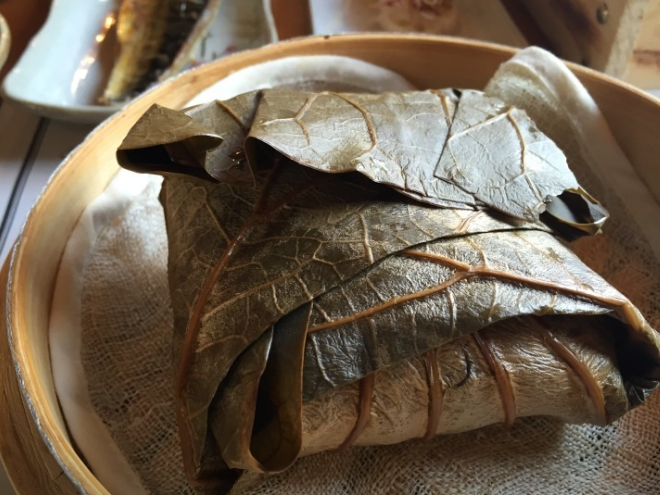연잎밥에는 기장,수수,녹두,팥, 통녹두,은행, 울타리콩,검정쌀,검정깨,호박씨과 같은 재료가 들어가며, 방금 쪄낸 찰밥에 연잎 향이 배어 있어 밥이 향긋합니다.