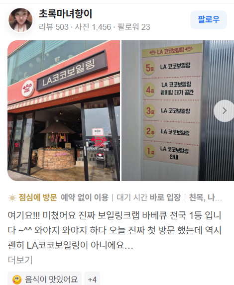 이 외에도 다양한 블로그에서 LA코코보일링의 후기를 찾아볼 수 있으며, 많은 사람들이 이곳을 추천하고 있습니다.