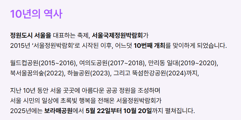 2025 서울국제정원박람회는 서울에서 열리는 가장 큰 정원 행사로, 자연과의 조화를 주제로 한 다양한 프로그램과 전시가 준비되어 있습니다.