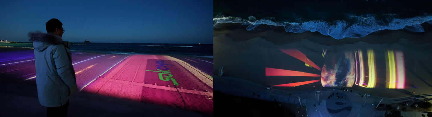 **'빛의 바다, 속초'**는 가로 70m, 세로 15m의 압도적인 규모를 자랑하는 전국 최대 규모의 모래사장 미디어아트입니다. 단순히 조명을 비추는 방식을 넘어, 주제에 맞게 정교하게 기획된 영상과 음악을 함께 송출해 보는 이들에게 차별화된 몰입 경험을 선사합니다.