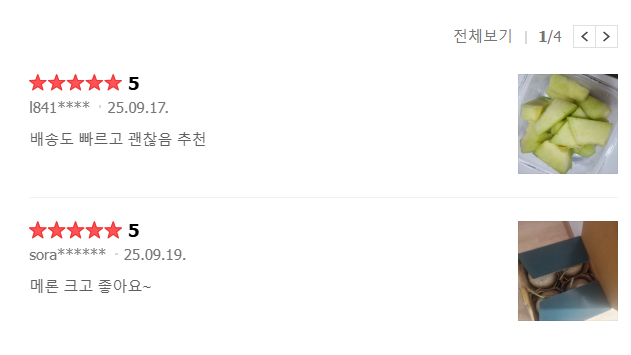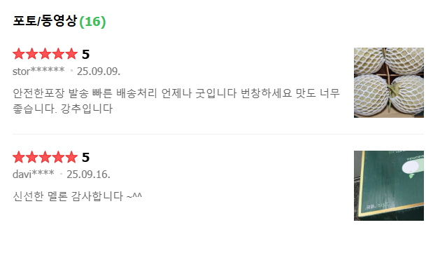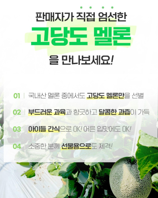 “당도가 높고 멜론 향이 진하다”, “서울에서 먹은 것과 비교해도 뒤지지 않는 품질”이라는 평이 많습니다. 소비자들이 신선함과 맛에서 만족도가 높다는 후기가 많아요. - 배송 & 포장 만족