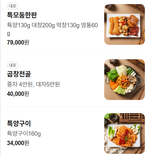 | 특모둠한판 | 특양 + 대창 + 막창 + 염통 세트 | 다양한 곱창류를 한 번에 맛볼 수 있는 인기 메뉴 |