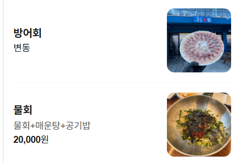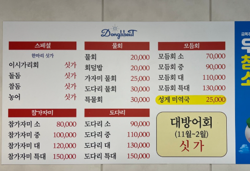 - 자연산 회는 계절에 따라 메뉴가 달라질 수 있음