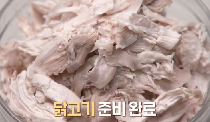 2. 삶은 닭을 건져 살만 발라내기 좋게 찢어 한 김 식혀두고, 육수는 냉장고에 넣어 차게 해 둡니다.