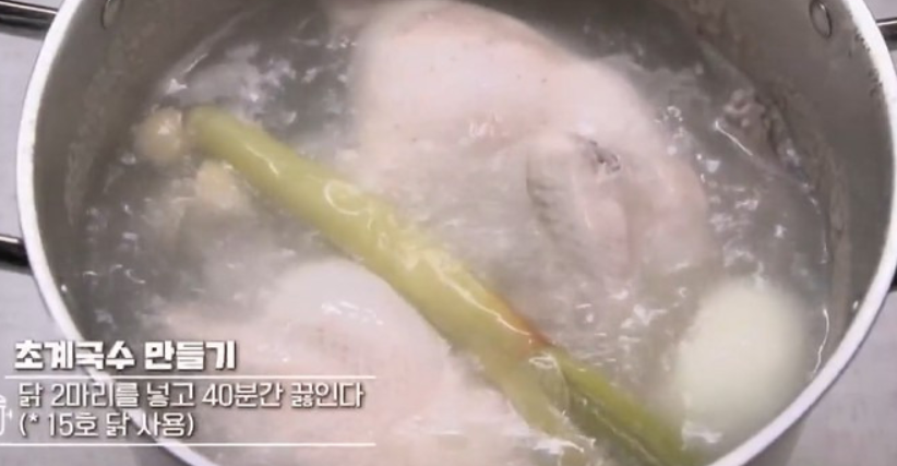 1. 냄비에 물을 붓고 대파, 마늘, 생강, 양파, 닭 2마리를 넣고 40분간 푹 끓입니다.