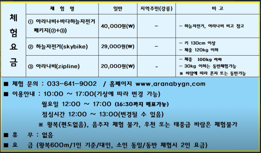 높은 곳에서 내려다보는 정동진 바다 풍경 덕분에 커플 여행, 가족 체험 코스로 인기가 높으며, 스릴은 있지만 비교적 안전하게 설계되어 있습니다.