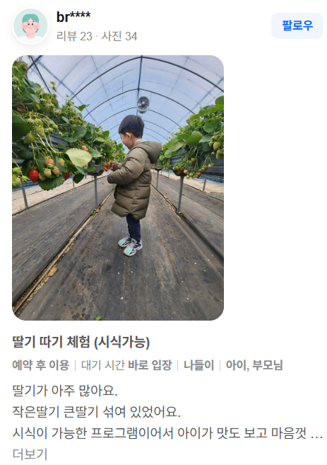직접 따서 먹는 딸기의 신선함이 일반 마트 딸기와 확실히 다르다는 반응이 있어요.