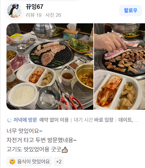- 이용시간 제한(일반적으로 2시간), 테이블링 앱 원격 줄서기 가능, 외부 음식/주류 반입 금지 등의 규칙이 있음. 기본 세팅비 + 숯불비 등이 발생함.