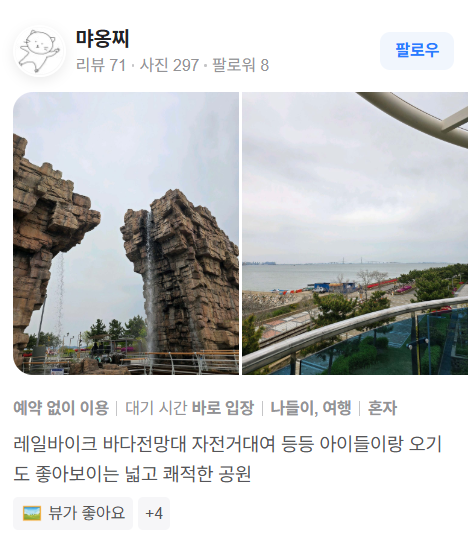 • 레일바이크: 5.6km 왕복 코스, 4인승 구성, 바다 경관과 경관폭포 및 조형물 감상 가능