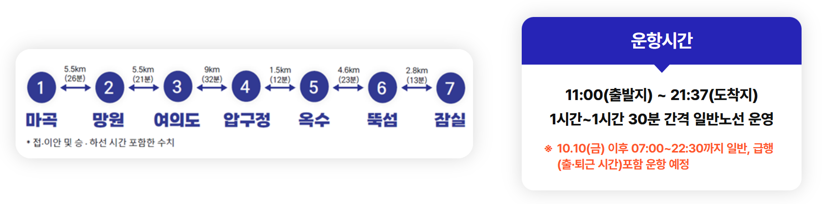 하지만 현재는 출퇴근 목적으로 완벽히 자리잡기에는 일부 운항 시간·주기·소요 시간 등의 제약이 있으므로, 목적과 시간대를 고려해 이용하는 것이 좋습니다.