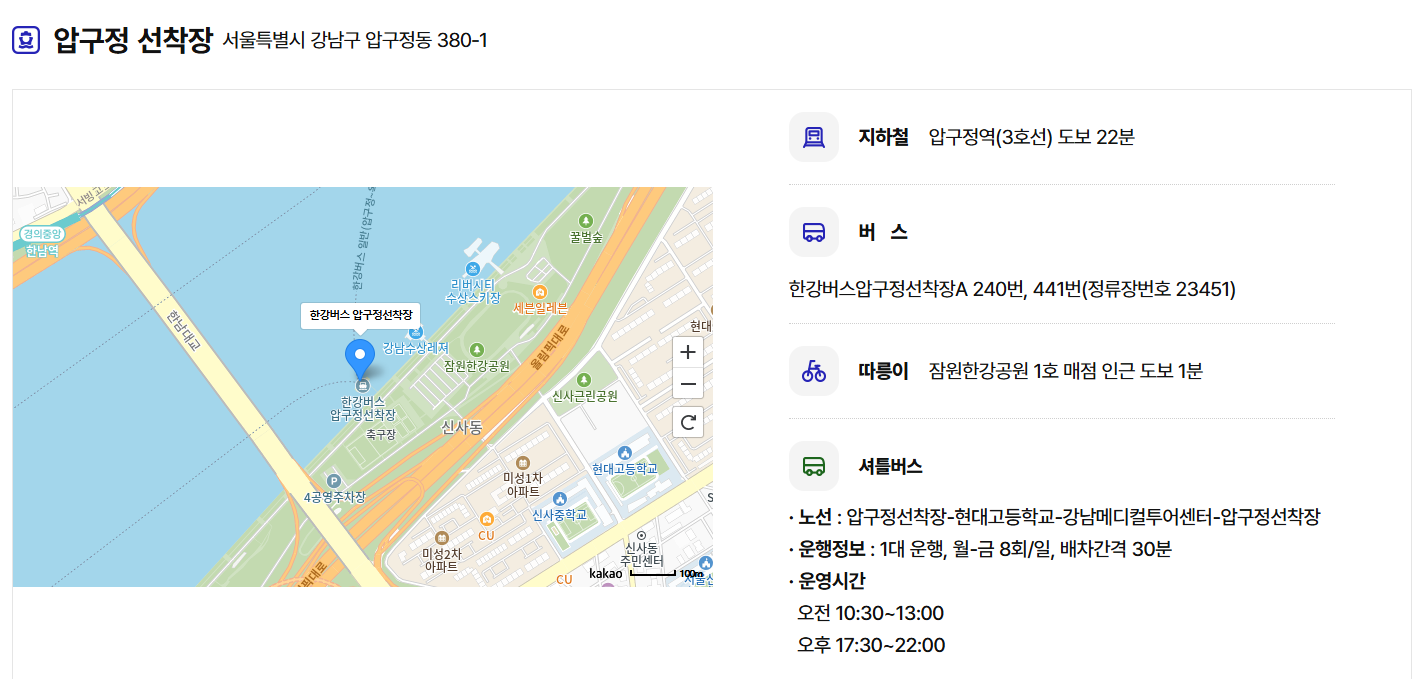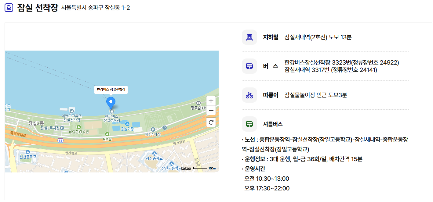 - 접근성: 각 선착장은 대중교통(지하철, 버스) 및 서울 공유 자전거 따릉이 등과 연계되어 있으며, 일부 선착장은 무료 셔틀버스 등 보완 교통수단과 연결됨.