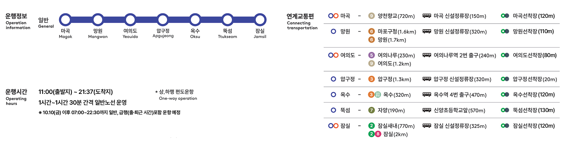 - 노선 길이 약 28.9km, 마곡 ↔ 잠실 구간 사이 7개 선착장(마곡, 망원, 여의도, 압구정, 옥수, 뚝섬, 잠실) 연결.