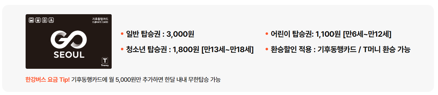 | 교통카드 및 할인 | 대중교통 환승 할인 가능. ‘기후동행카드’ 등 특정 카드로 무제한 이용 또는 할인 혜택 제공됨. |