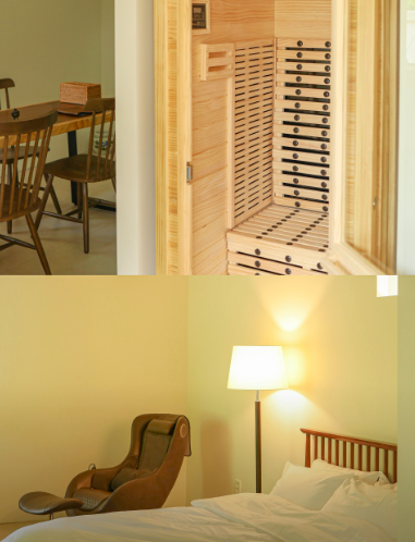 내부에는 2인침대 두개와 호텔침구, 통창뷰를 만끽할 수 있는 최고급 원목테이블, 에어드레서, 빔프로젝터, 안마의자, 바디드라이어, 편백사우나, 화장대와 다이슨 에어랩이 준비되어 있으며,