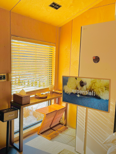 내부에는 2인침대와 호텔침구, 통창뷰를 만끽할 수 있는 테이블, 화장대와 다이슨 에어랩이 준비되어 있으며 주방에는 조리도구와 고급식기, 여러종류의 음료잔, 인덕션, 드롱기토스터와 전기포트, 커피머신과 비스포크 냉.온수정수기가 설치되어 있습니다.