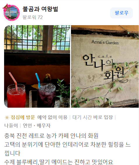 주인장의 정성과 손길이 안닿은 곳이 없을 정도로 아름다운 충북 진천의 고즈넉한 한옥카페에서 힐링하시길 추천드립니다.