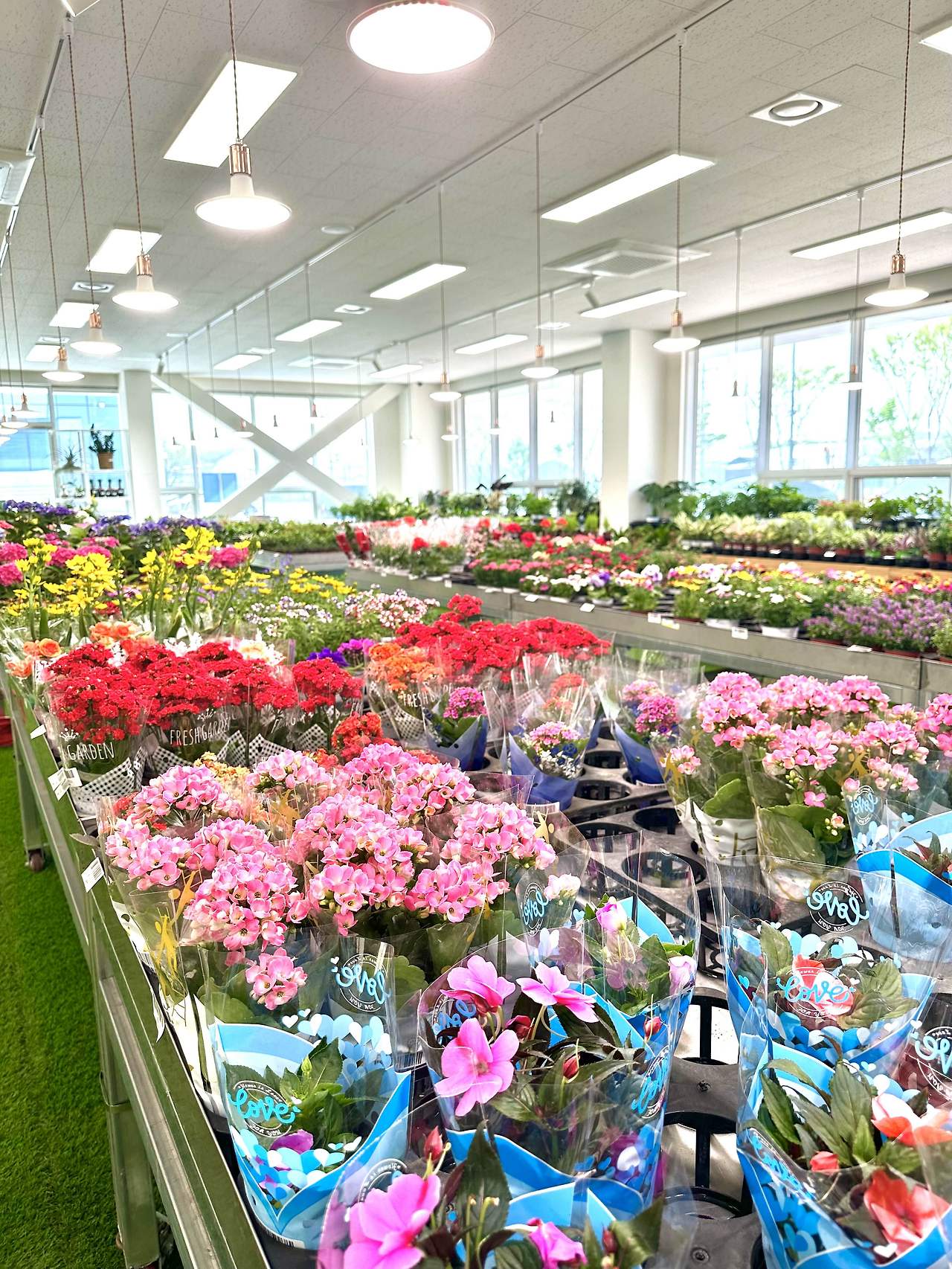 넓고 쾌적한 공간으로, 다양한 식물과 꽃들이 정갈하게 진열되어 있습니다.