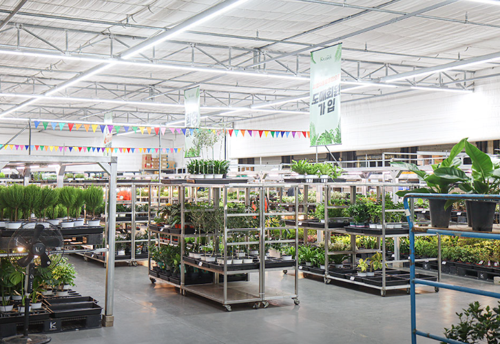 넓고 쾌적한 공간으로, 다양한 식물과 꽃들이 정갈하게 진열되어 있습니다.