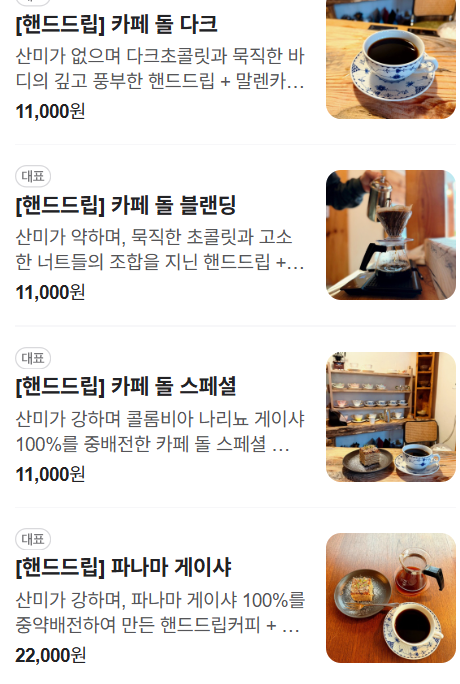 카페 돌의 대표 메뉴는 핸드드립 커피입니다.