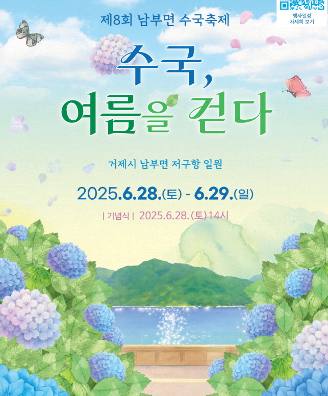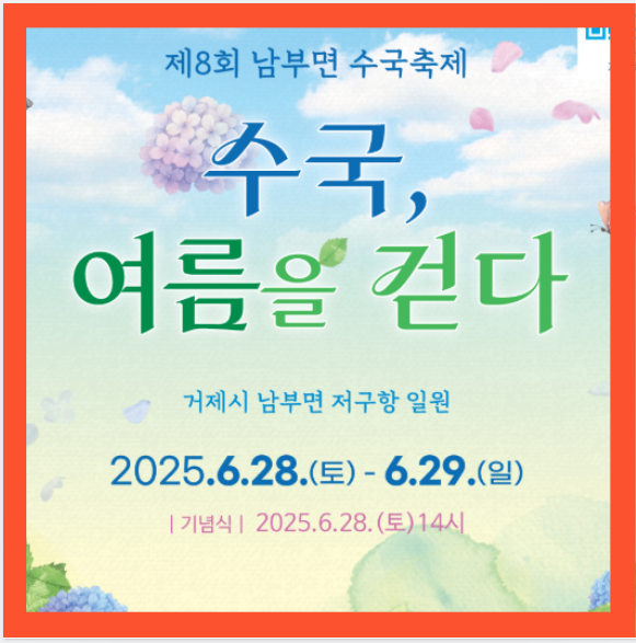20년 강산이 두 번 변한다는 긴 시간 동안 땀흘려 가꾸어 온 여름꽃의 여왕 "수국"의 아름다움과 천혜의 자연환경을 품고 있는 거제 대표 관광지 남부면을 대외적으로 알리기 위해 매년 수국축제를 개최하고 있습니다.