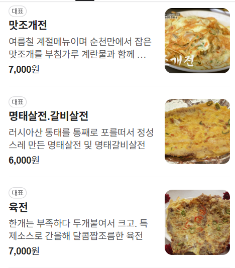- 인기 메뉴는 육전, 맛조개전, 칠게튀김, 명태갈비살전, 새우전 등 다양하고 합리적인 전 요리입니다.