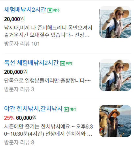 • 체험 배낚시(오전/주간): 오전 10시·12시·14시·16시 등 출항 있으며 2시간 코스 진행