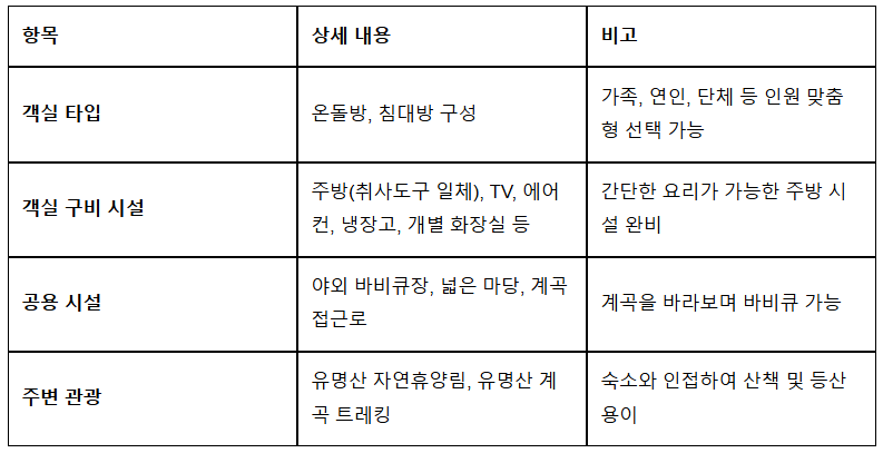 산과 계곡이 어우러진 청정 자연 속에 위치해 있어 가족·연인·단체 여행객에게 여유로운 휴식 공간을 제공합니다.
