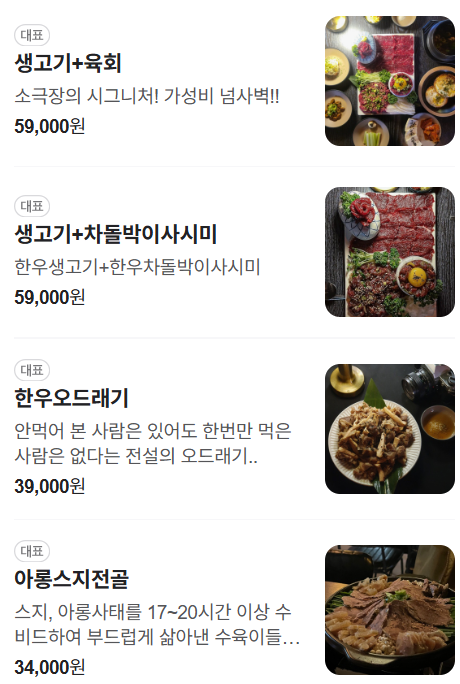 - 메뉴 구성은 한우 육회 및 17시간 이상 수비드한 아롱사태 전골, 오뎅탕, 소불고기 전골 등 다양하고 정성 듬뿍인 요리가 특징입니다