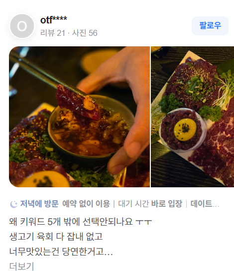 - 메뉴와 맛: “차돌박이 육회”와 “전통주 하이볼”을 함께 즐길 수 있는 메뉴 구성에 높은 만족도를 보입니다