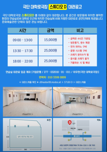 극단 대학로극장은 연습실 스튜디오D를 함께 운영하고 있습니다.