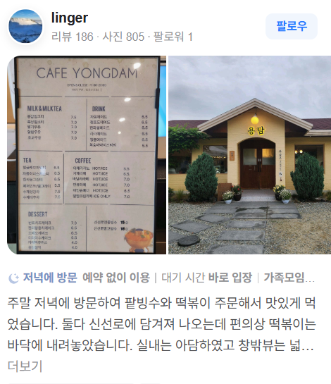 카페,용담에는 귀여운 웰시코기 상주견이 있으며 보틀 밀크티와 신선로 빙수가 준비되어 있습니다.