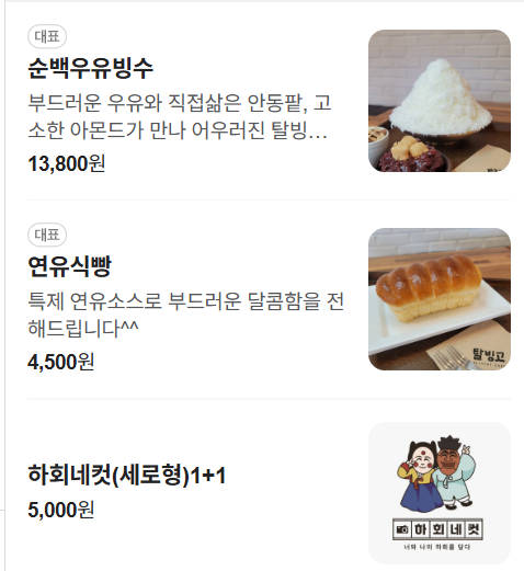 - 탈빙고는 안동 하회마을 근처의 인기 카페로, 순백우유빙수와 연유식빵이 대표 메뉴입니다.