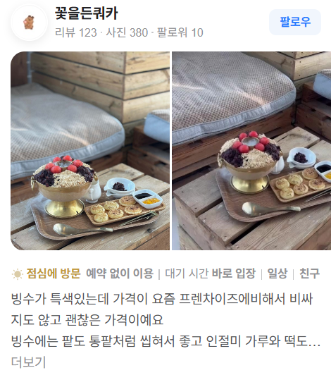 - 빙수는 부드럽고 고소한 우유 얼음과 함께 팥, 아몬드, 인절미 토핑이 제공되어 아이들도 즐기기 좋습니다.