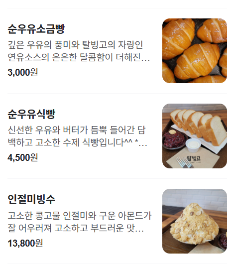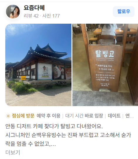 - 탈빙고는 안동 하회마을 근처의 인기 카페로, 순백우유빙수와 연유식빵이 대표 메뉴입니다.