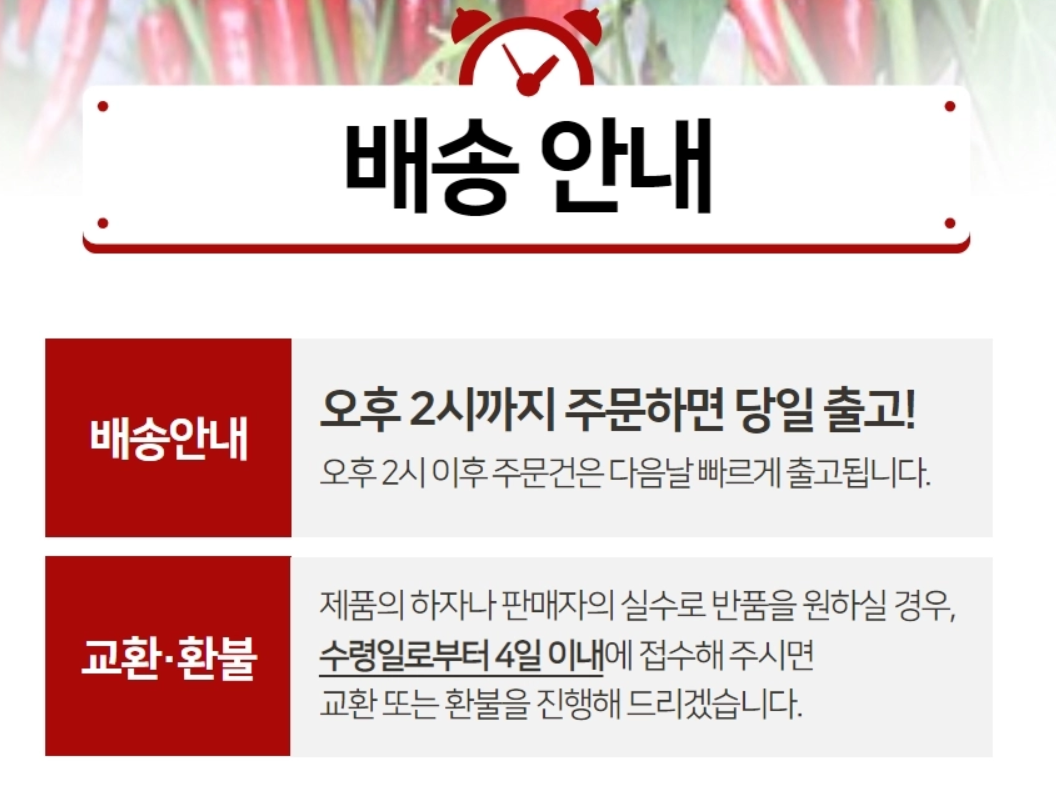 • 위생 관리: 꼭지 제거 + 세척 과정을 거쳐 깨끗한 건고추 제공