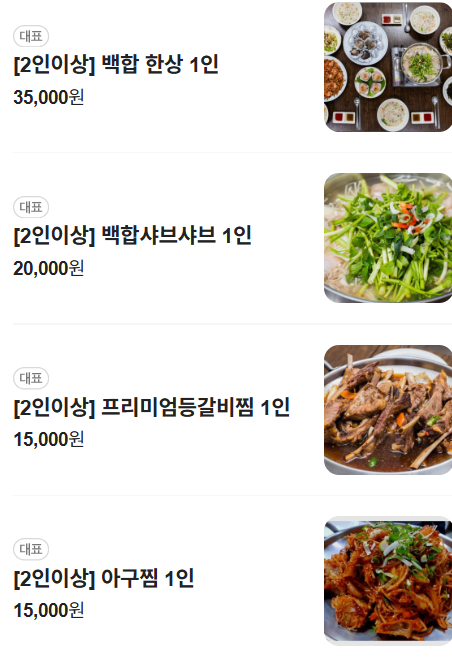 1. **백합정식** : 1인분에 35,000원으로, 신선한 백합과 다양한 반찬이 함께 제공됩니다.