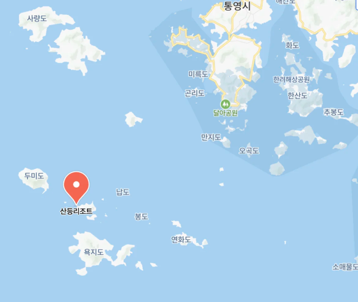 산등리조트는 욕지면 노대리에 위치해 있으며, 주변에는 여러 작은 섬들이 있습니다.