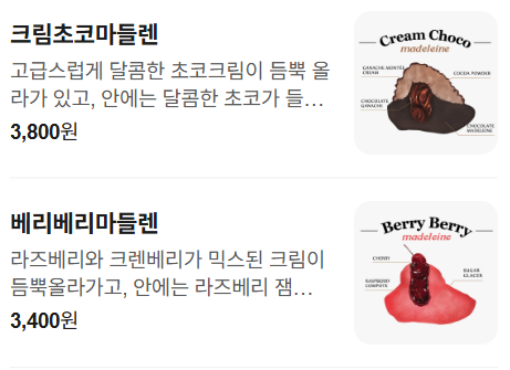 | 구움과자 / 마들렌 / 타르트 / 치즈케이크 등 디저트류 | 크림 올라간 마들렌 등이 SNS상 인기 & 디저트로 소개됨 |