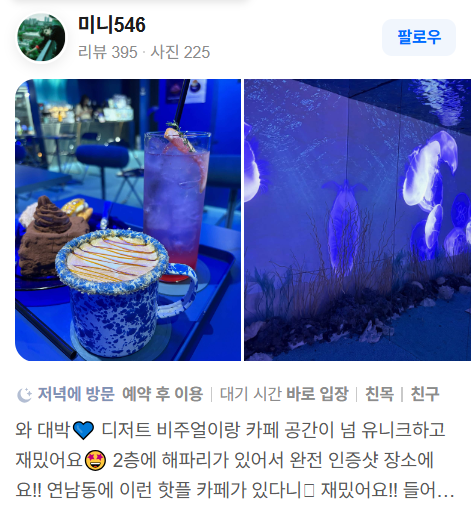 “심해 분위기 너무 몽환적이다”, “해파리 영상, 조명, 산호 소품 등이 포토스팟” 등의 평이 많음. - 시그니처 음료 언급