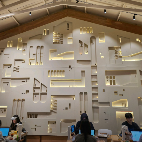 - 건축사무소를 모티프로 한 카페로, 설계도면, 트레이싱지, 건축도구 등이 인테리어 요소로 자리하고 있습니다.