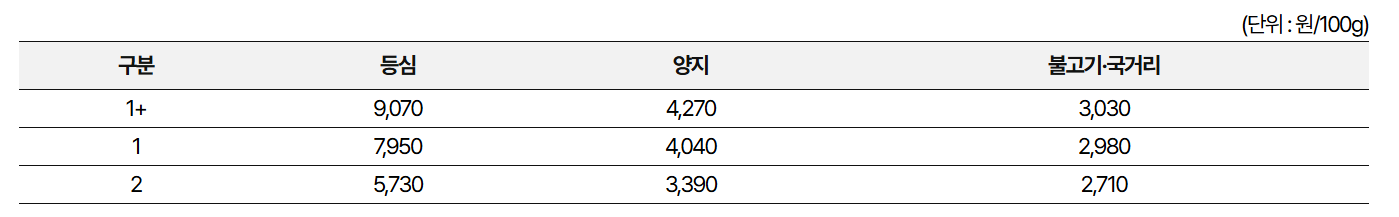 - 예컨대 최근 행사에서는 1등급 기준으로 100g당 등심 7,460원 이하, 양지 3,550원 이하, 불고기·국거리 2,670원 이하로 판매되었다는 보도가 있습니다.