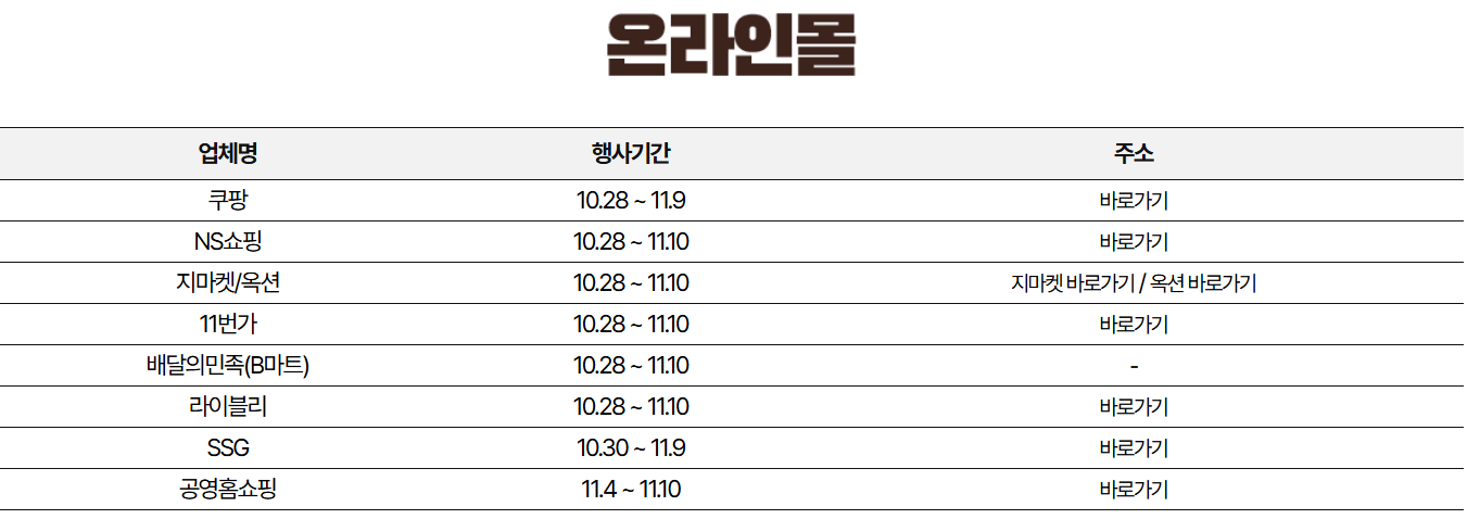 - 행사 참여 매장별, 온라인몰별로 정확한 일정은 다를 수 있으므로 사전 확인이 필요합니다.