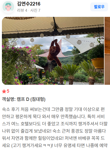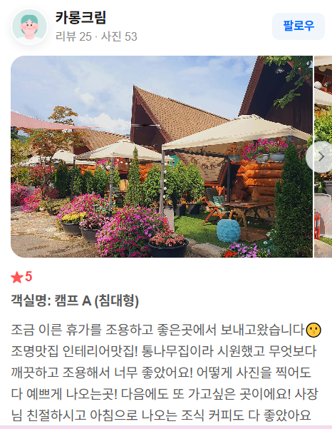 - 자연 속 힐링 숙소: 계곡과 숲 소리, 고요한 환경이 여행객들에게 매우 긍정적이라는 평가.