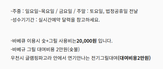 바베큐 이용시 숯그릴 사용비 2인기준 2만원 / 숯추가시 1만원입니다.