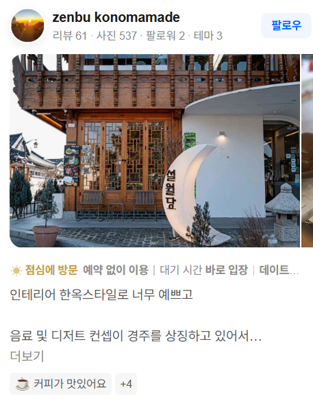 - “한옥 분위기가 정말 예쁜 카페입니다.”