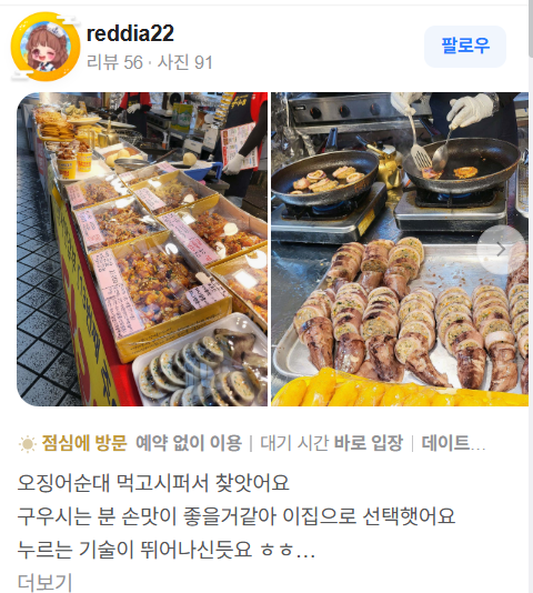 - 가격에 대한 만족도도 높음 (“가격 대비 매우 훌륭하다”)는 리뷰 많음. 특히 시장 간식으로 적당한 가격선이라는 의견 많음.