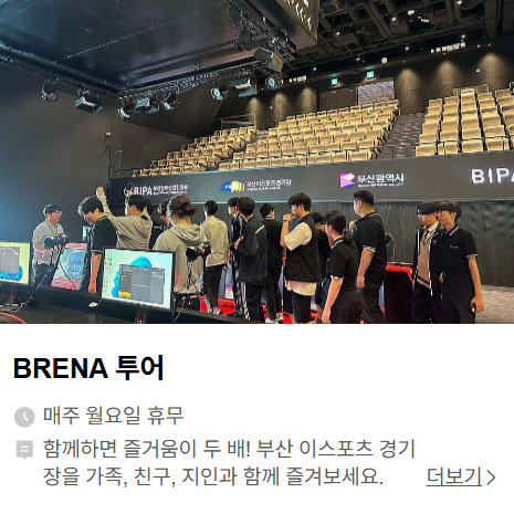 부산이스포츠경기장(BRENA : Busan Esports ARENA)은 이스포츠 대회를 비롯하여 공연, 이벤트, 프로모션 등 남녀노소 누구나 찾아와 즐길 수 있는 문화 융복합공간입니다.